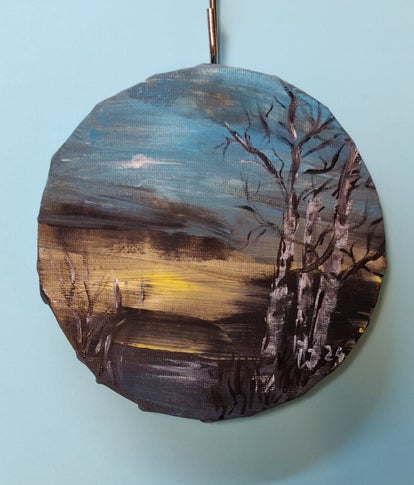 Dieses kleine Landschaftsbild habe ich mit Acryl auf Leinwand gemalt, die auf einen Holzrahmen gespannt ist und mit einer Öse zum Aufhängen versehen ist.