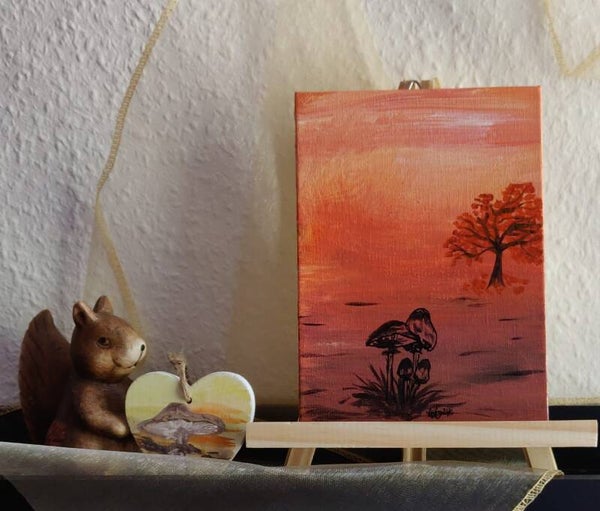 Dieses Bild ist mit Acryl auf Leinwand-Karton gemalt. Eine kleine Schirmpilz-Familie steht einsam in einer trostlosen Umgebung und möchte gefunden werden. Dieses Motiv ist wahlweise mit oder ohne Rand erhältlich und hat eine Öse zum Aufhängen.