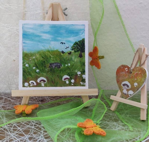 Diese Bilder sind mit Acryl auf Leinwand-Karton gemalt und sind selbsterklärend: Champignons auf der Wiese und am Wegesrand. Eine ungestörte Idylle, wie man sie nur noch selten findet. Hier biete ich kleine Varianten mit Enten...mit Widschwein...mit Wildschwein an. Sie sind ähnlich entzückend, jedoch jedes für sich einzigartig.