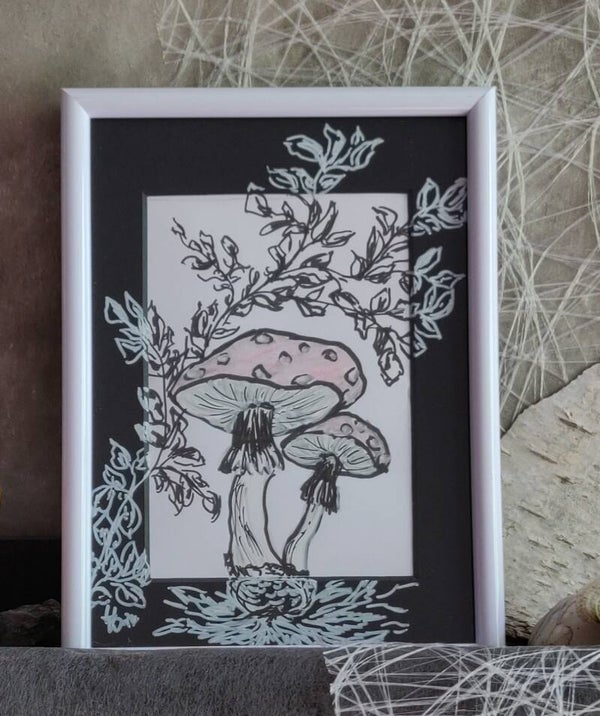 Die "Fliegenpilze" wurden mit schwarzem Acrylstift auf weißem Untergrund gezeichnet. Auf dem schwarzen Passepartout wird die Zeichnung mit weißen Acrylstiften weitergeführt, so dass sich daraus ein 3D-Effekt ergibt.