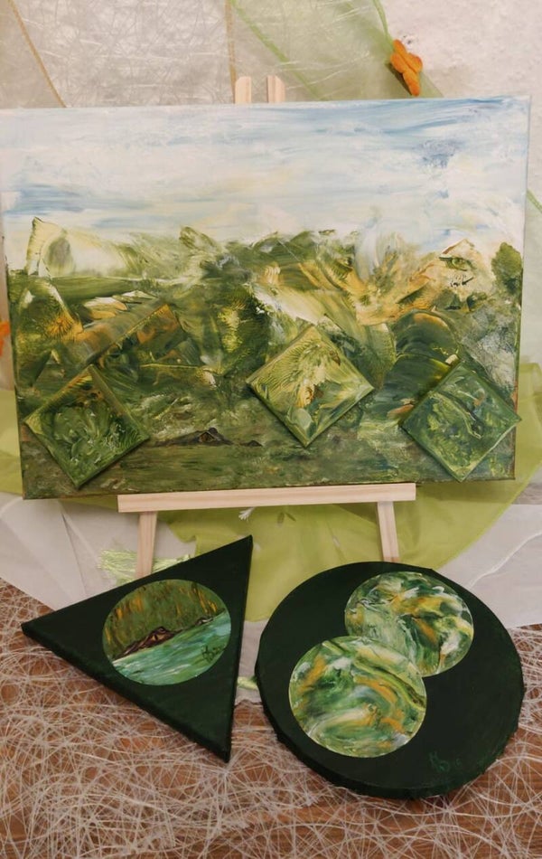 Dieses Acrylbil habe ich mit einem dunkelgrünen Untergrund versehen, der die Tiefe des Dschungels symbolisiert. Darauf befindet sich ein kreisrunder Dschungel-Ausschnitt mit einem Krokodil, das nur das bernsteinfarbene Auge verrät.