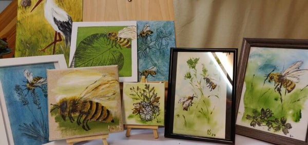 Ich habe sie mit Acryl auf eine kleine Leinwand gemalt, die auf einen Rahmen gespannt und mit einer Öse zum Aufhängen versehen ist.