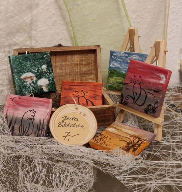 Ich habe kleine Leinwände liebevoll mit Acryl bemalt und mit einer Öse zum Aufhängen versehen. Es stehen eine Reihe von Motiven zur Auswahl: Landschaften, Katzen, Pilze, Federn...